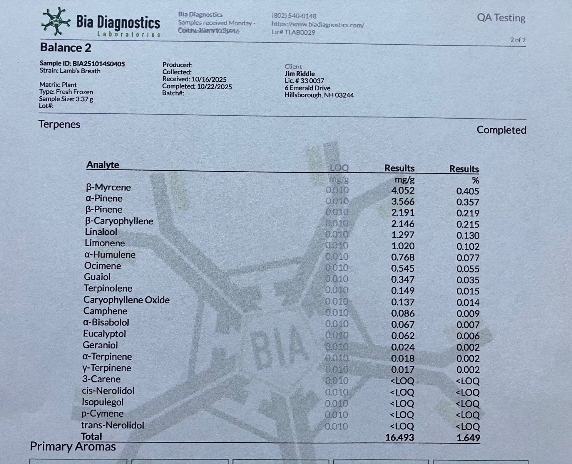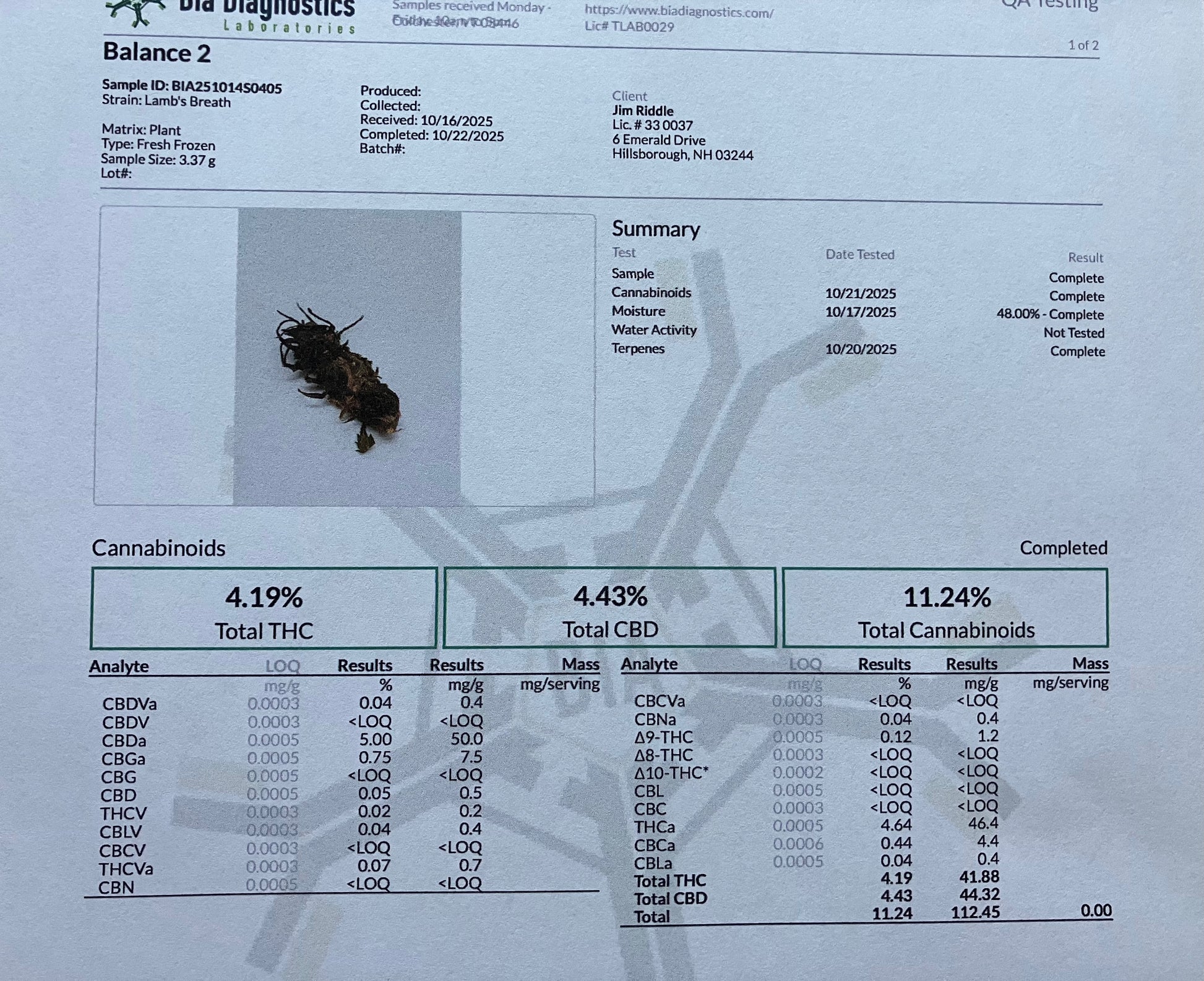 The Balance II seed mom tested: THC - 4.19%; CBD - 4.43%; Total Cannabinoids - 11.24%. Top terpenes are myrcene, a-pinene, b-pinene and caryophyllene.